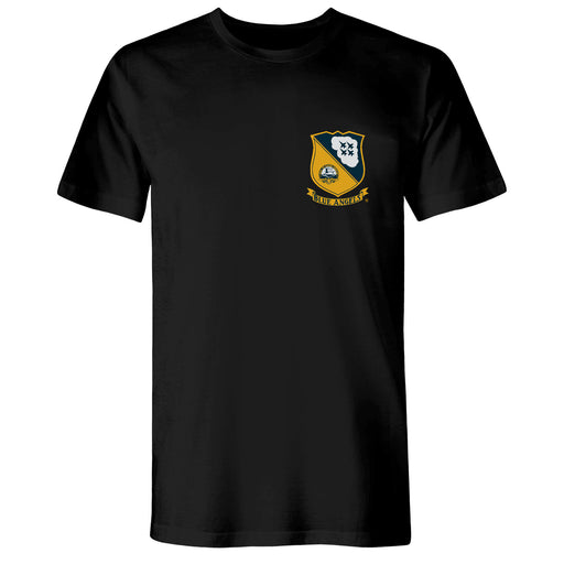 The Blues is a black t-shirt featuring the official Blue Angels logo on the front and back, similar to the apparel worn by their crew. The Blue An...
